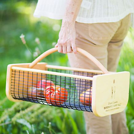 Terrain Pine + Maple Garden Carry-All A Gentle Way to Haul in Produce.This spacious hand-crafted garden basket is ideal for carrying fruits and vegetables, cut flowers, and more from the garden. The maple, pine, and metal mesh materials are sturdy and beautiful.This spacious hand-crafted garden basket is ideal for carrying fruits and vegetables, cut flowers, and more from the garden.